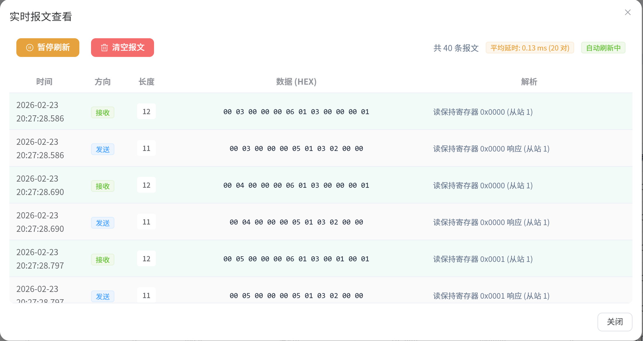 - 报文解析:平台支持对原始十六进制报文进行自动解析,将各个数据段映射为直观的字段含义(如功能码、具体寄存器的一次值)。