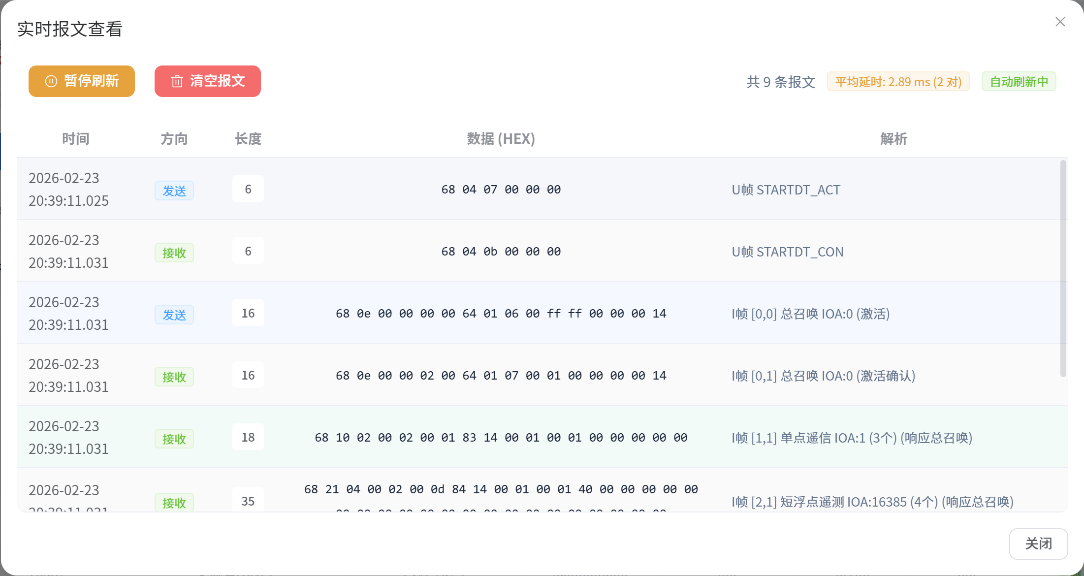- 报文交互:可以通过报文过程快速确认连接建立验证(U帧)、总召唤命令下发及测点数据上送(I帧)、确认信号(S帧)等流程。