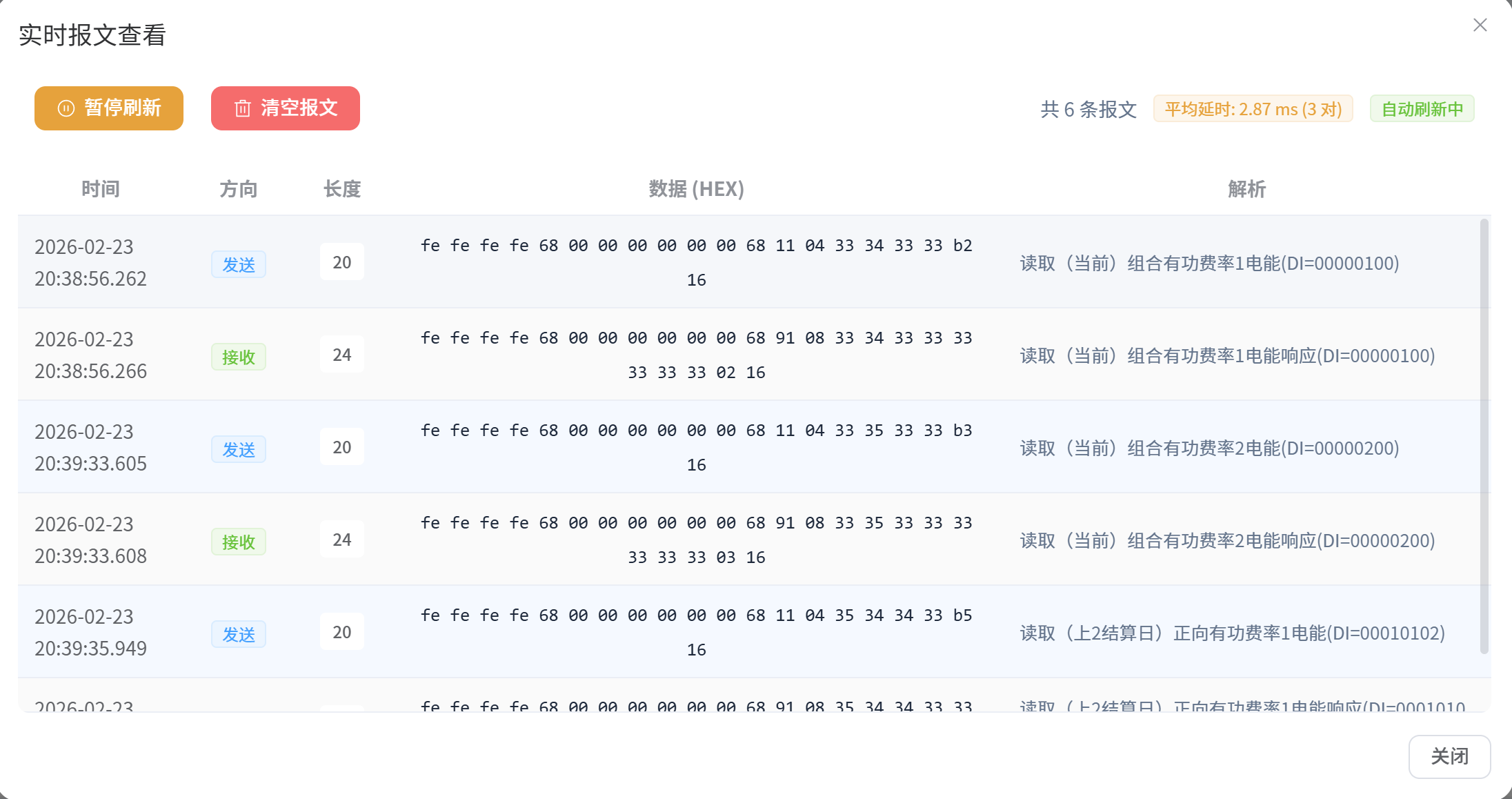 - 报文解析:支持对抄表返回的原始数据块进行深入解析,例如电表实际的电量度数、状态字或异常标识等。